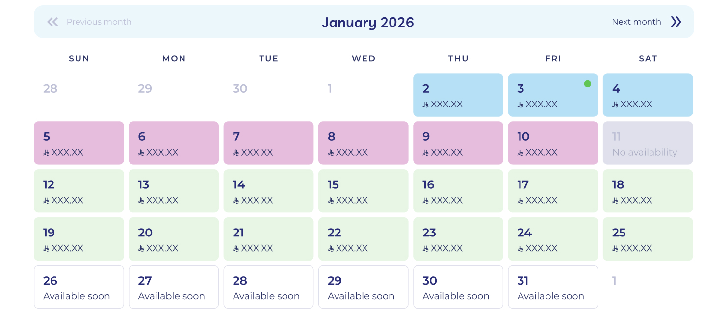 A dynamic calendar with pricing indicators allows users to select dates based on availability and peak pricing, with a month-to-week transition for easier selection.